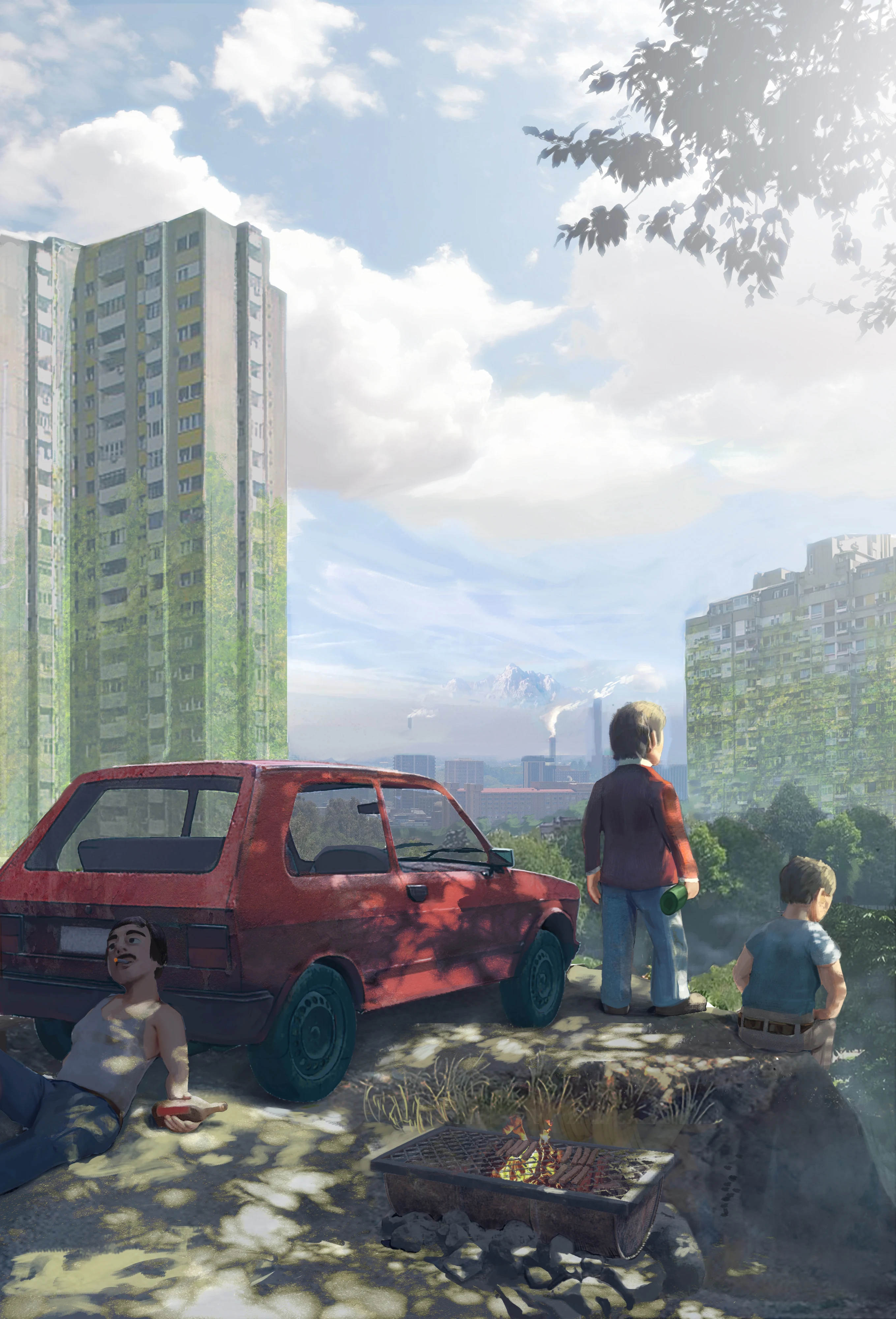 Cooperative survival scene from Yugopunk showing multiple players sitting on a car after a catastrophe